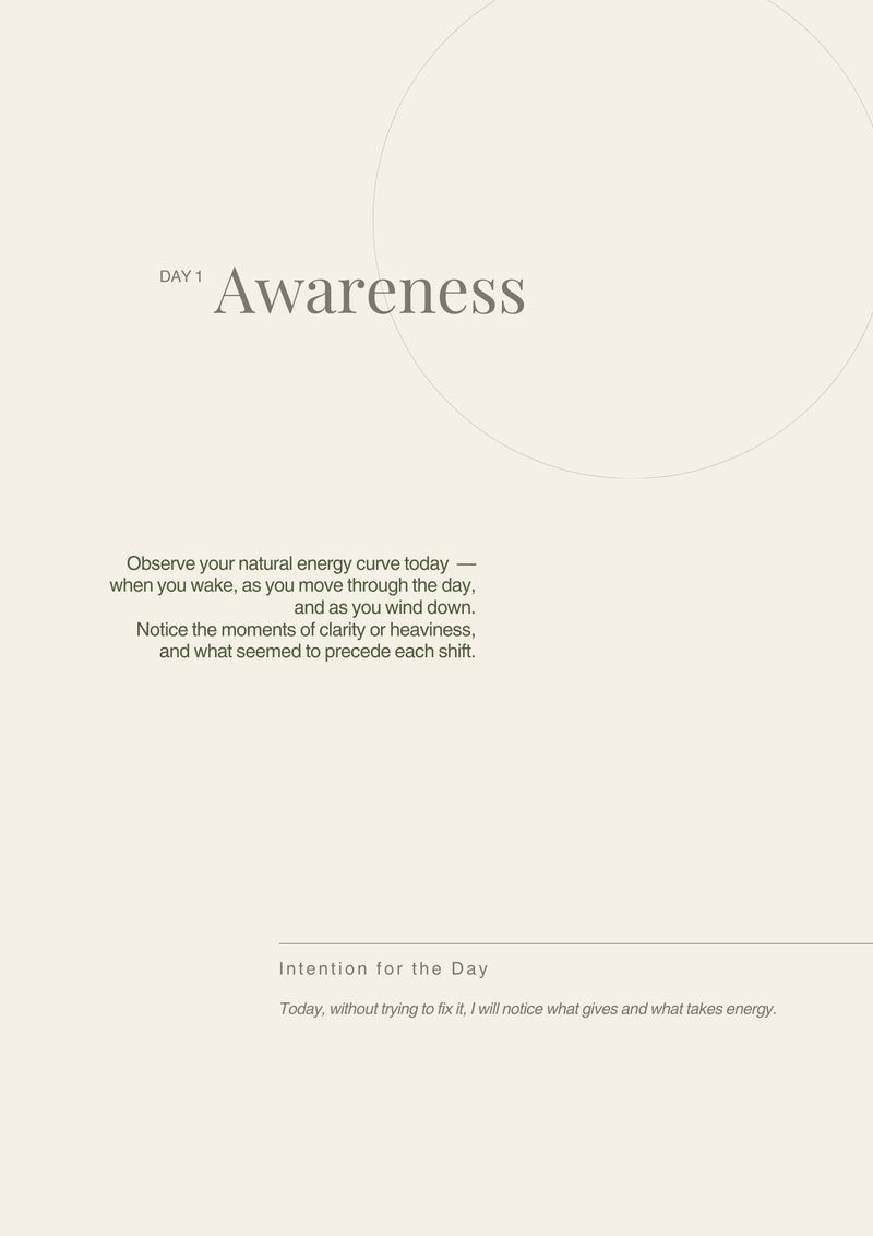 Energy Reset is a seven-day guide designed to help you observe your energy with more clarity and compassion. Through daily check-ins, body awareness prompts, and simple rituals, this guide invites you to slow down, tune in, and rebuild trust with yourself.